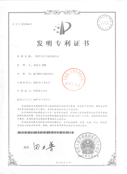 实验室于2004年申请的一项发明专利“一种含书写时序信息的动态汉字字库的处理方法”目前收到国家知识产权局通知,该项申请已经通过审查,正式获得国家发明专利授权。这是实验室本年度荣获的第二项发明专利授权。